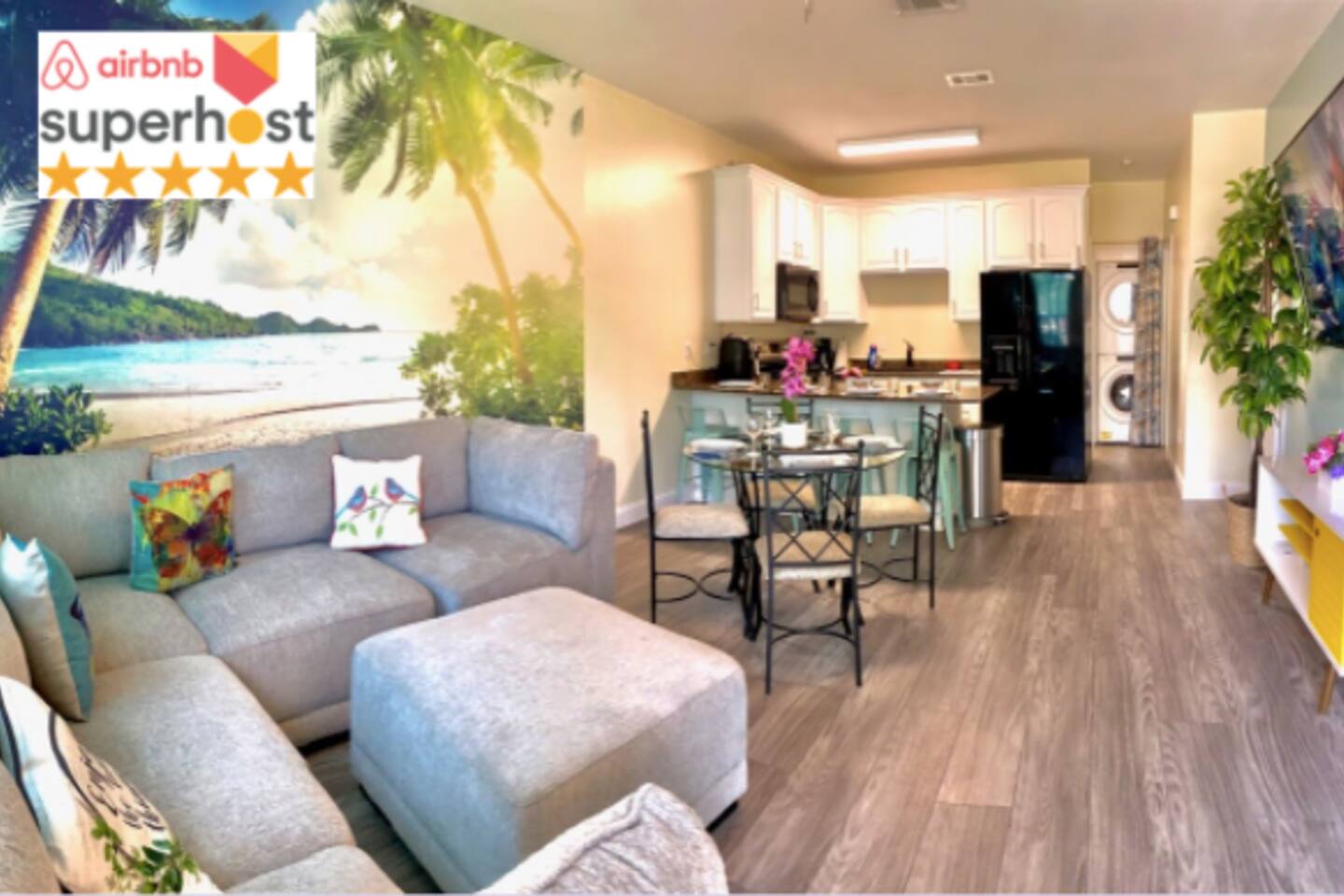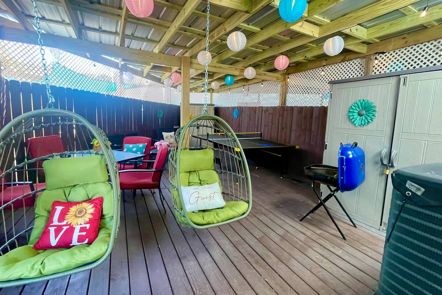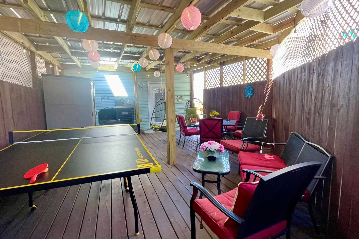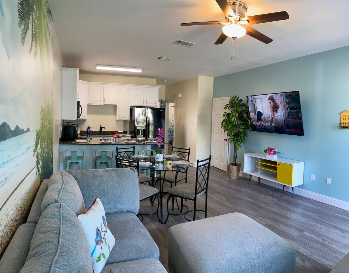 We have the ONLY 2 beach townhouses in the gated complex with COVERED huge bak patio with Ping-Pong Table and 2 Egg Chairs Swings. Escape to our newly remodeled townhouse, just a 5-minute walk away from the beach with Smart TVs, beach essentials, and a BBQ grill. Plus, we're located away from the noisy train tracks unlike many other rentals in the complex. Book now and enjoy a peaceful beach getaway. Note: We have a strict no pets policy due to server health allergies