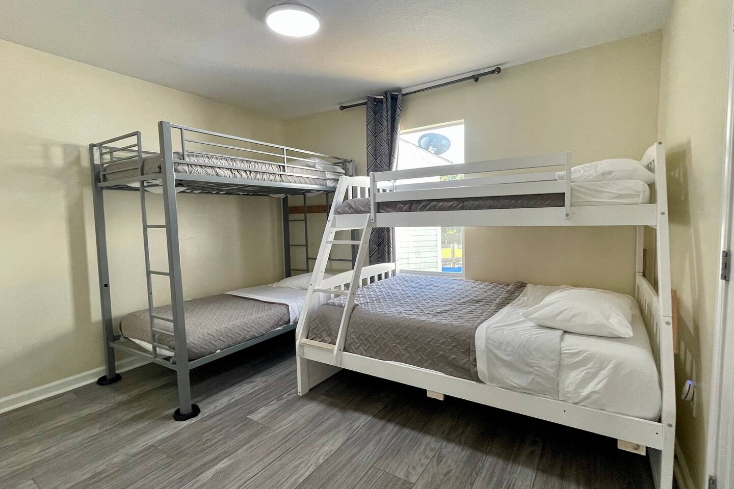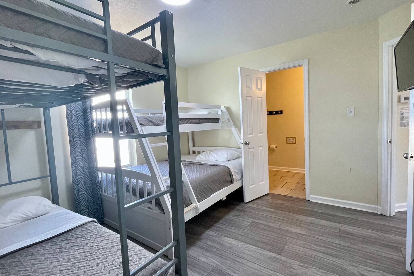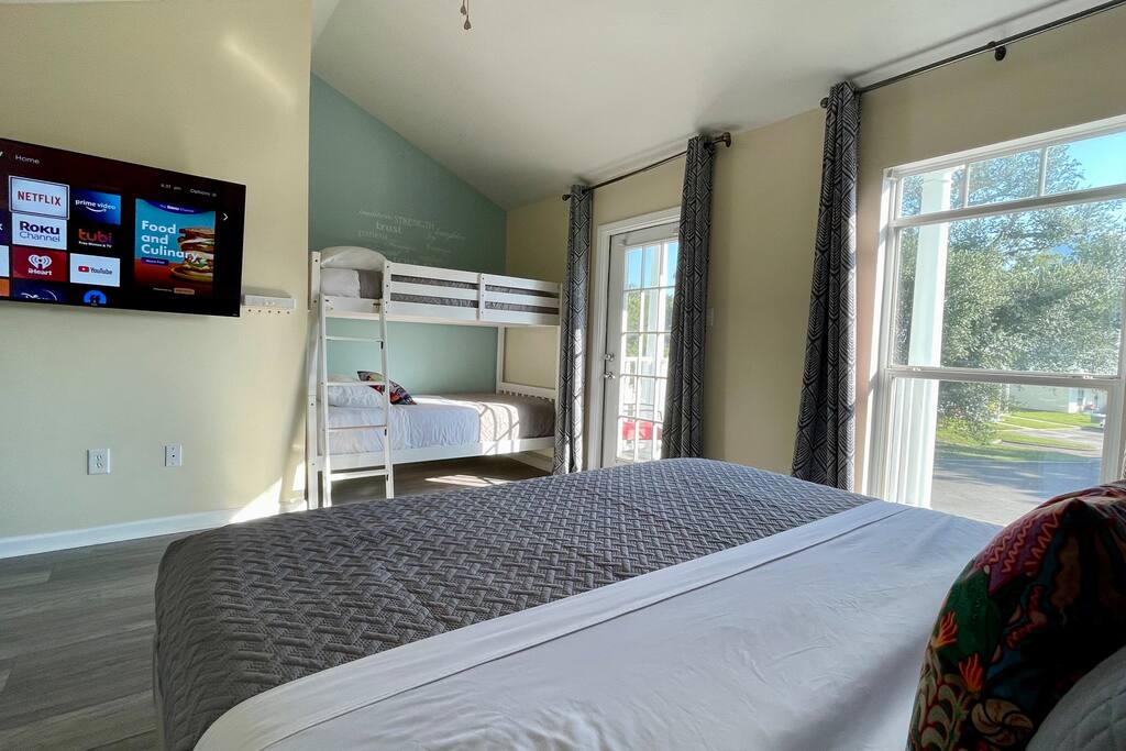 Welcome to our newly remodeled townhouse in Gulfport, Mississippi, where you'll experience exceptional customer service from experienced SUPERHOSTS! Our collection of awesome reviews from our guests speaks for itself. Our 3-bedroom, 3-bathroom home is just one block away from the beach and features a large private enclosed and COVERED patio deck with a fenced yard, game room, BBQ grill, and table and chairs. You'll find stainless steel appliances in our fully equipped kitchen, along with a stacked washer and dryer for your convenience. Upstairs, the first bedroom comfortably sleeps 4-6 with TWIN-over-TWIN and TWIN-over-FULL size bunk beds, a 28-inch flat screen Smart TV, a large closet, and a private full bathroom. The second bedroom has a KING size bed, a 40-inch flat screen Smart TV, a walk-in closet, and a private full bathroom. Downstairs, the third bedroom has a QUEEN bed, a 32-inch flat screen Smart TV, and a doorway to the patio deck. Free Wi-Fi is available throughout the house, and all of our Smart TVs offer access to your own Netflix and Hulu accounts. For your comfort and convenience, we provide a beach wagon and chairs, as well as other amenities. Please note that we have a strict no-pet policy due to severe health allergies. Our gated complex offers a shared outdoor swimming pool, and we have 8 identical townhouses available for large family gatherings. We can't wait to welcome you to our stunning townhouse in Gulfport! Please contact owner Kim for more information.