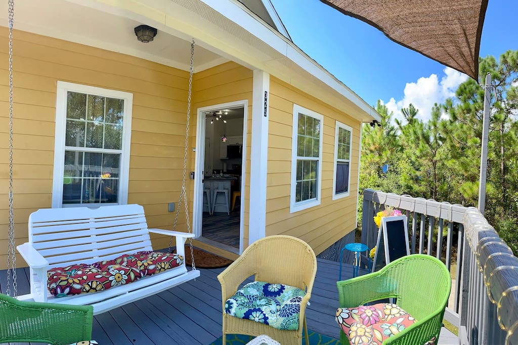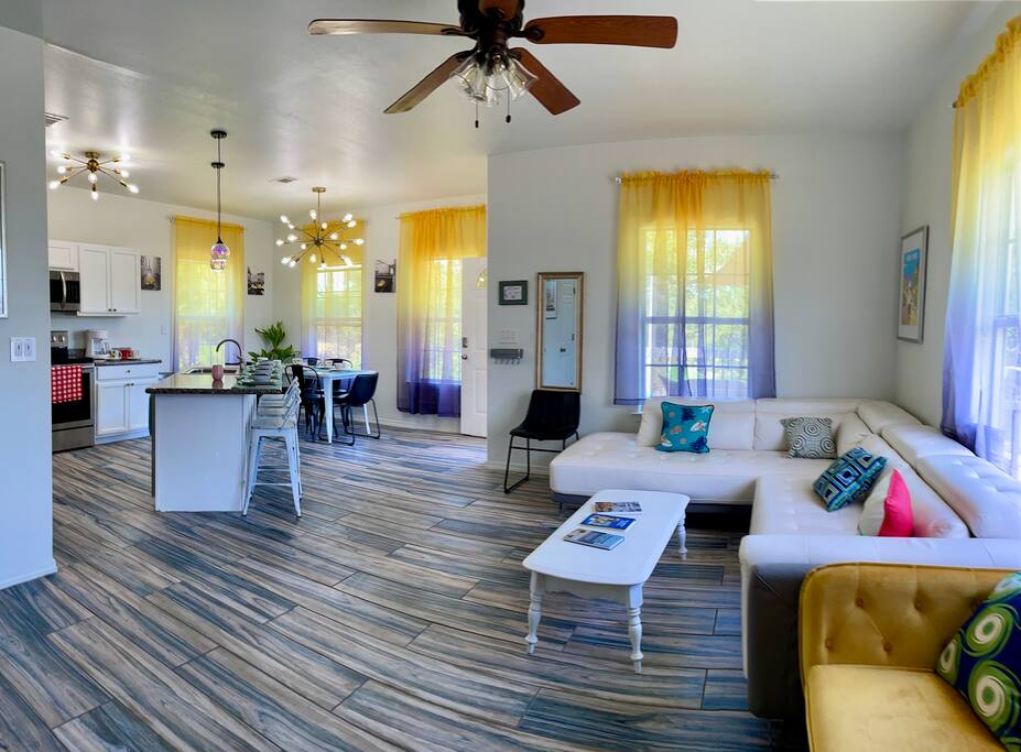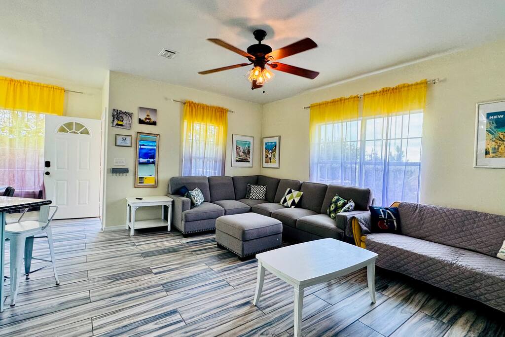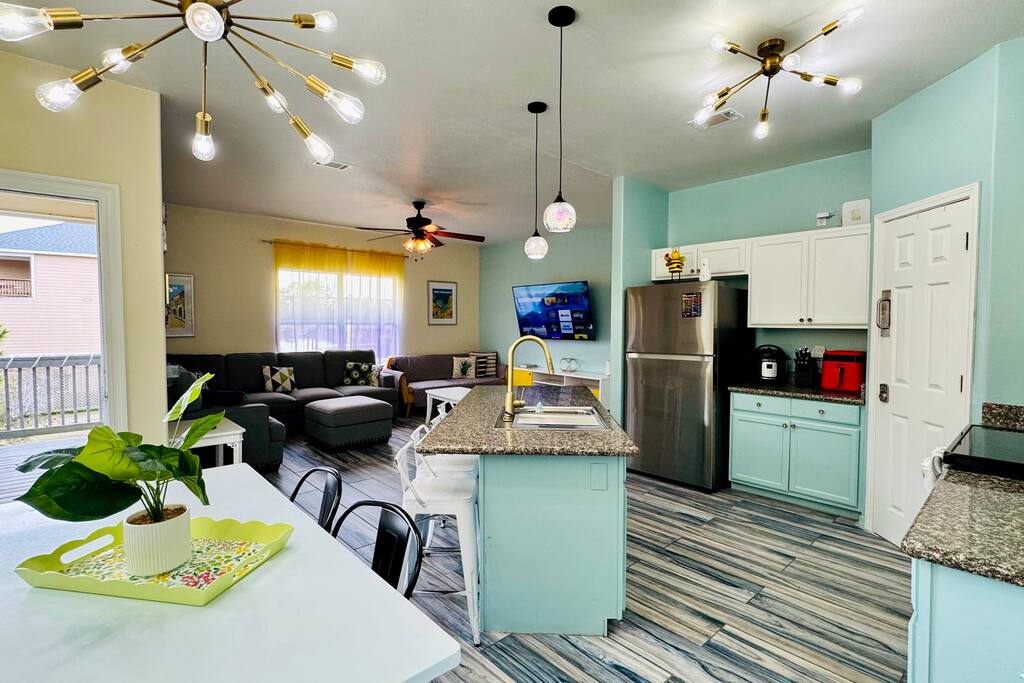 Experience resort-style living at our vibrant and colorful vacation house! Our passion for the arts is reflected in every corner, creating a fun and comfortable atmosphere for your stay. Our back patio overlooks a serene lake, and we're only three blocks away from the sandy beach. LOCATION is key, and we've got you covered - our house is the farthest away from the noisy active train, ensuring a peaceful and restful sleep. Note: We have a strict NO PETS policy due to a severe HEALTH allergies